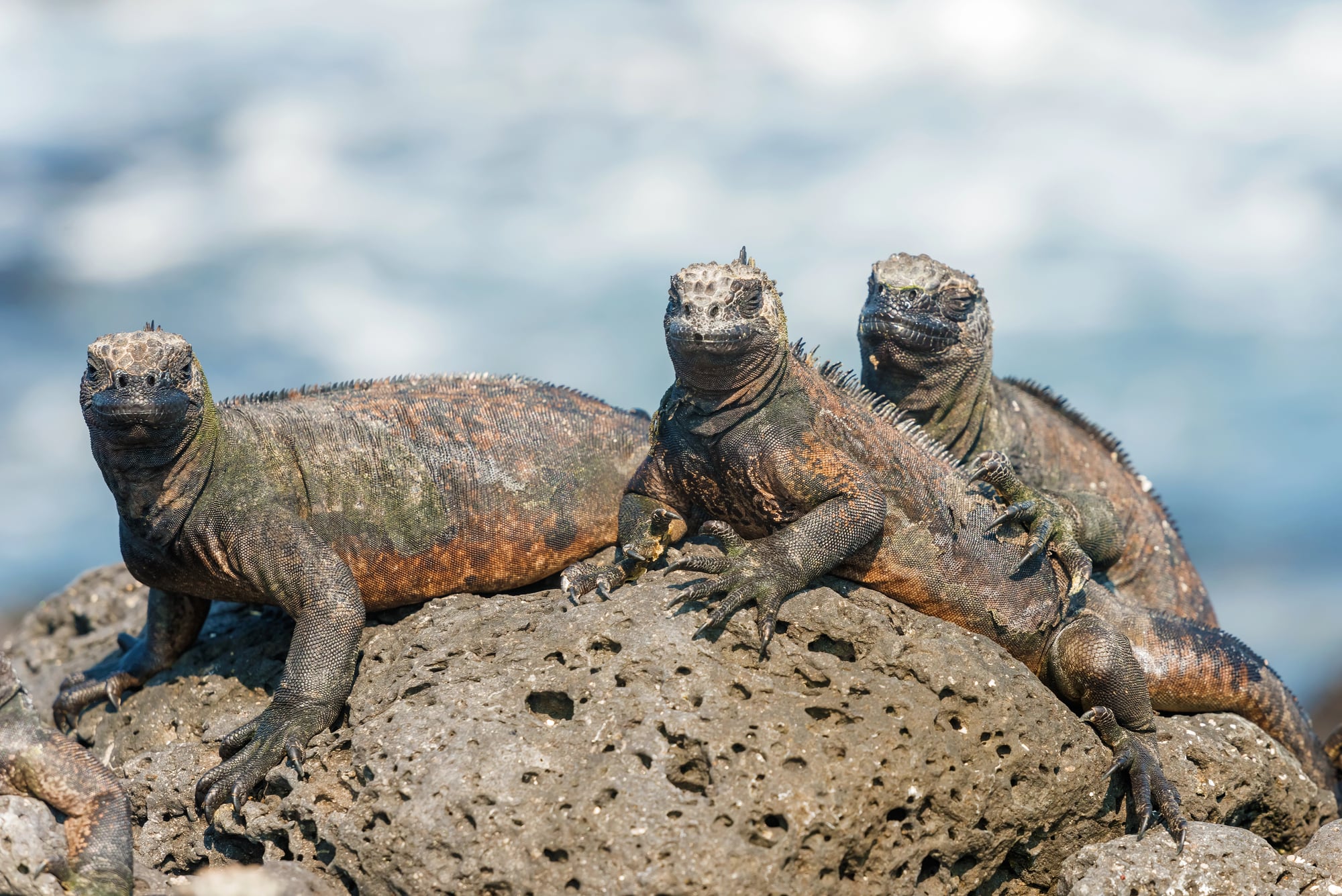 The Galápagos marine iguana treats volcanic coastlines like a luxury spa resort. These dark-scaled reptiles bask on black lava rocks to warm their bodies after diving into cold ocean waters to feed on algae.