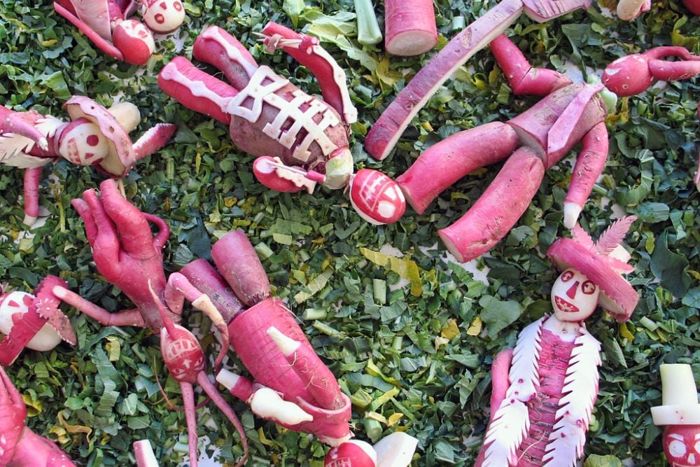 Every December 23rd, Oaxaca hosts the Noche de Rábanos, a competition among artists to produce the most striking sculptures carved exclusively from radishes. These are unique large kinds cultivated especially for this use, not little garden radishes.