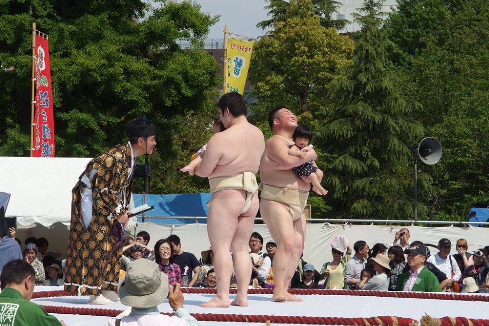 Japan’s Nakizumo Festival features sumo wrestlers holding babies and trying to make them cry. Two wrestlers face off, each holding a baby, while a referee makes scary faces and shouts to induce tears.