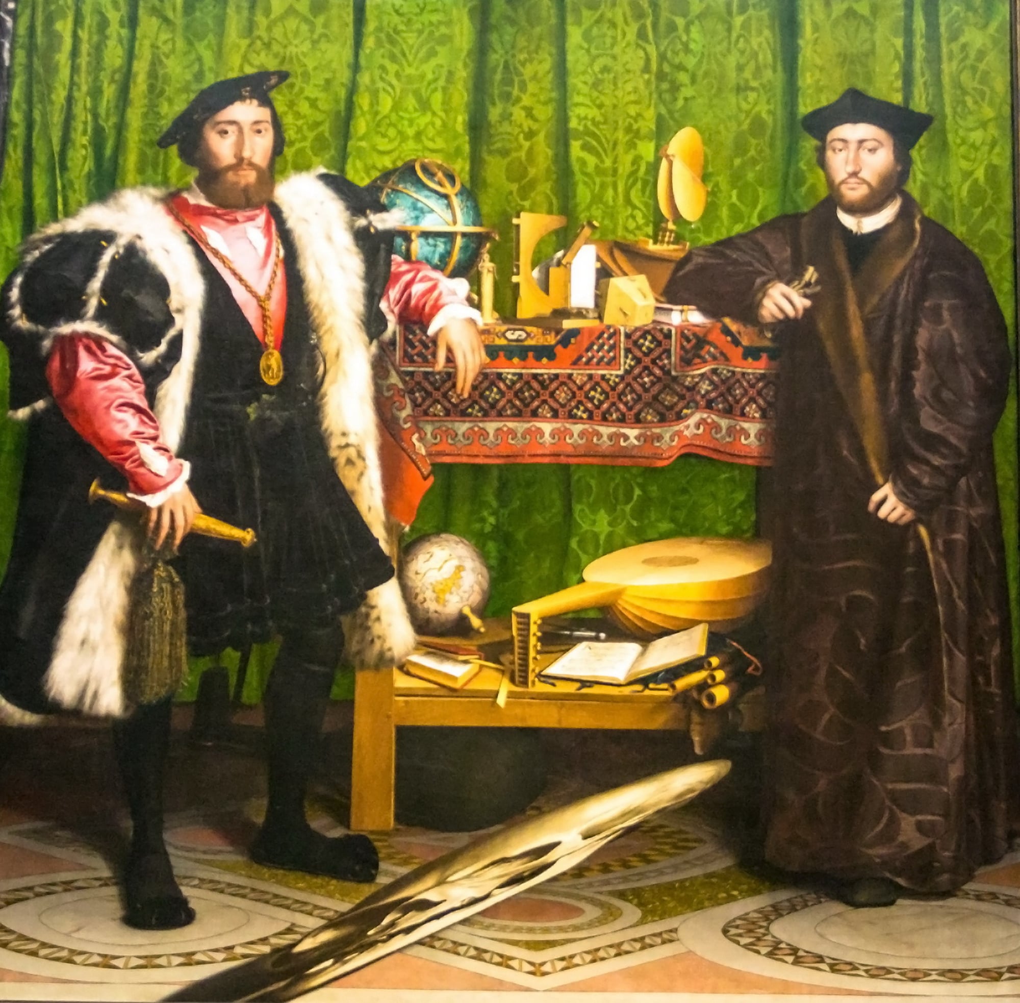 When viewed from the correct angle—far to the right and slightly below—the distorted shape snaps into perfect focus as a human skull, reminding viewers of mortality even amid displays of worldly success.