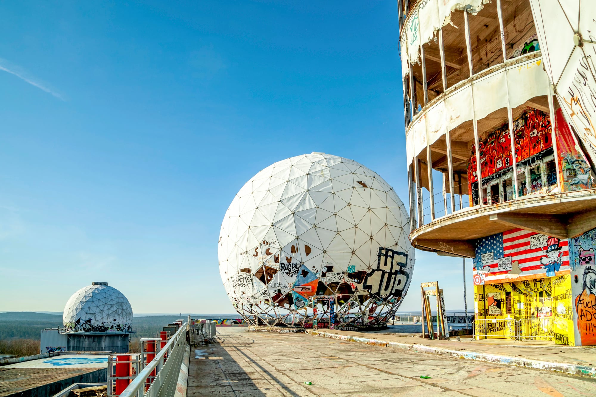 The massive radar domes now feature stunning murals visible for miles across the Berlin landscape.