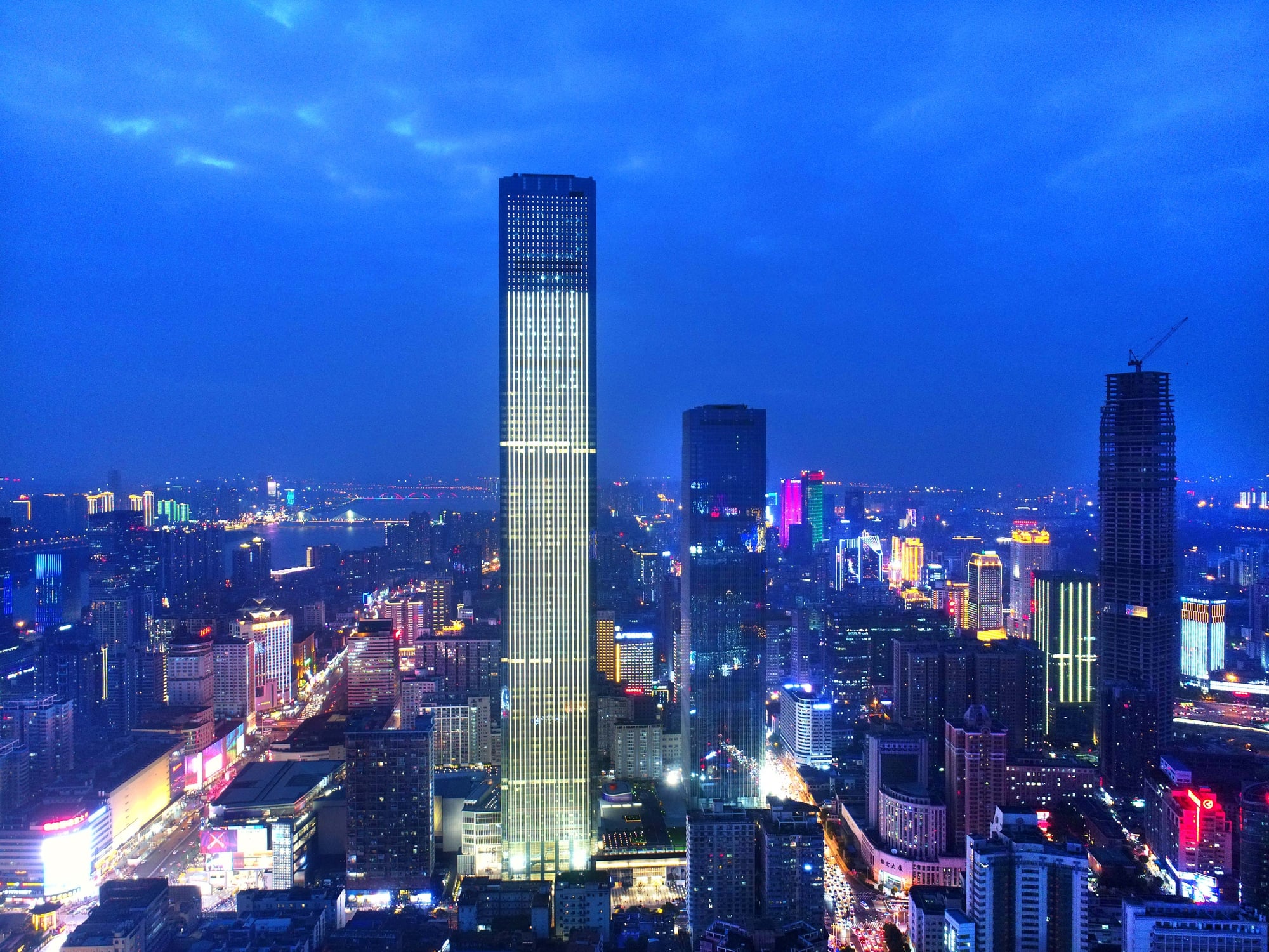 Its upper floors house a luxury hotel with guest rooms that offer panoramic views extending dozens of miles across the Xiangjiang River and surrounding Hunan Province on clear days.