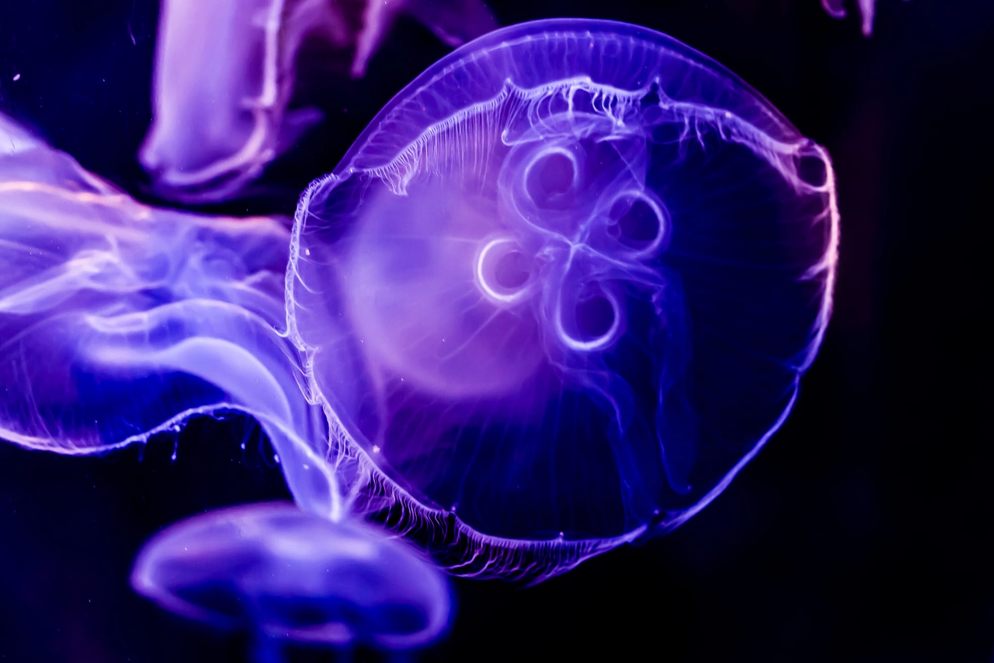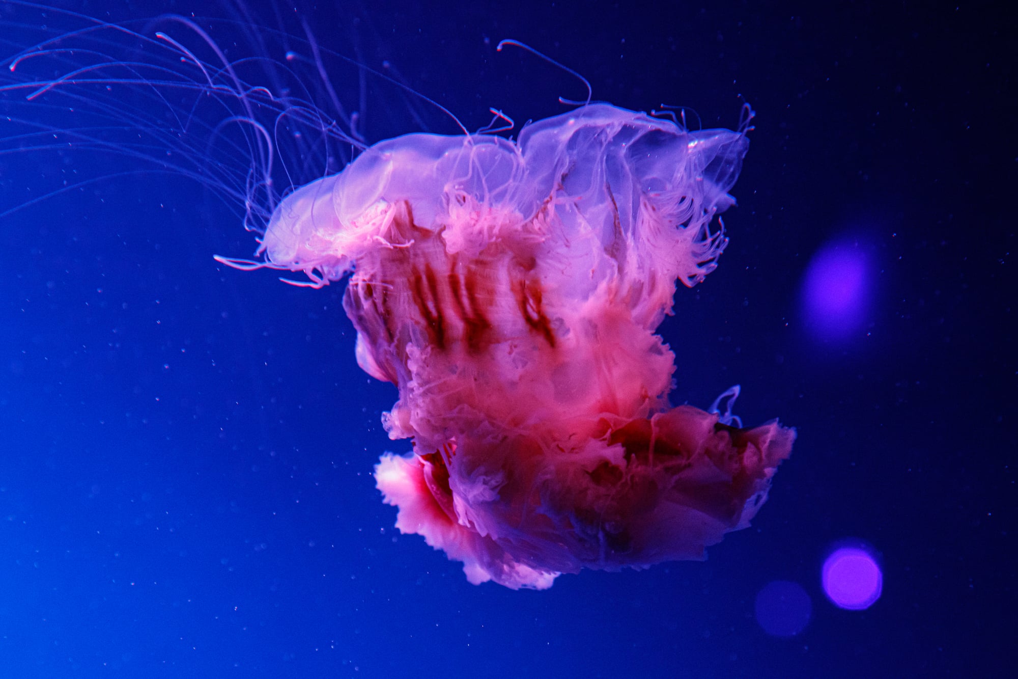 These chunky Australian natives come in wild color variations ranging from blue and purple to brown and white – looking like living mood rings drifting through the water. Blue blubbers lack traditional tentacles, instead sporting eight thick oral arms that they use to capture plankton and small fish.
