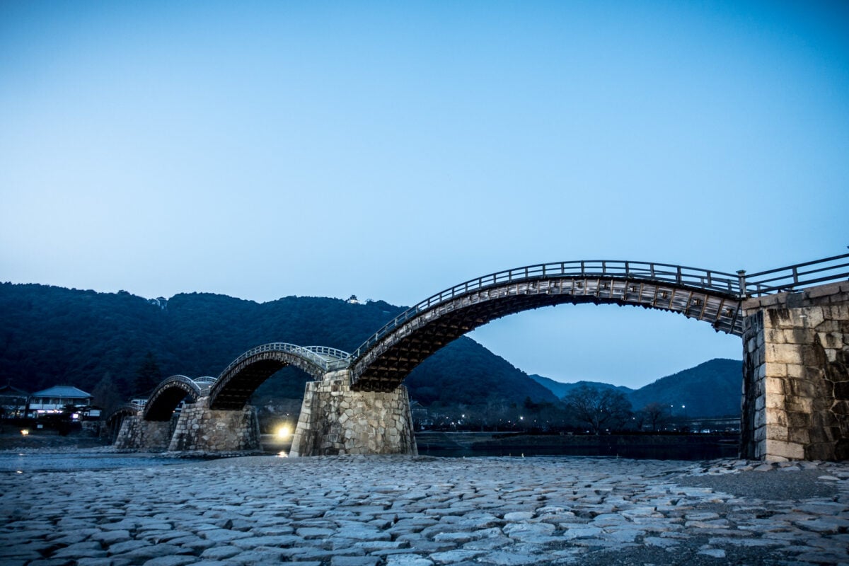 A wooden arch stands across the water at Iwakuni – this one called Kintai Bridge – rising again each time storms knocked it down. Three hundred fifty years carry stories of collapse, then rebuilding, again and again.