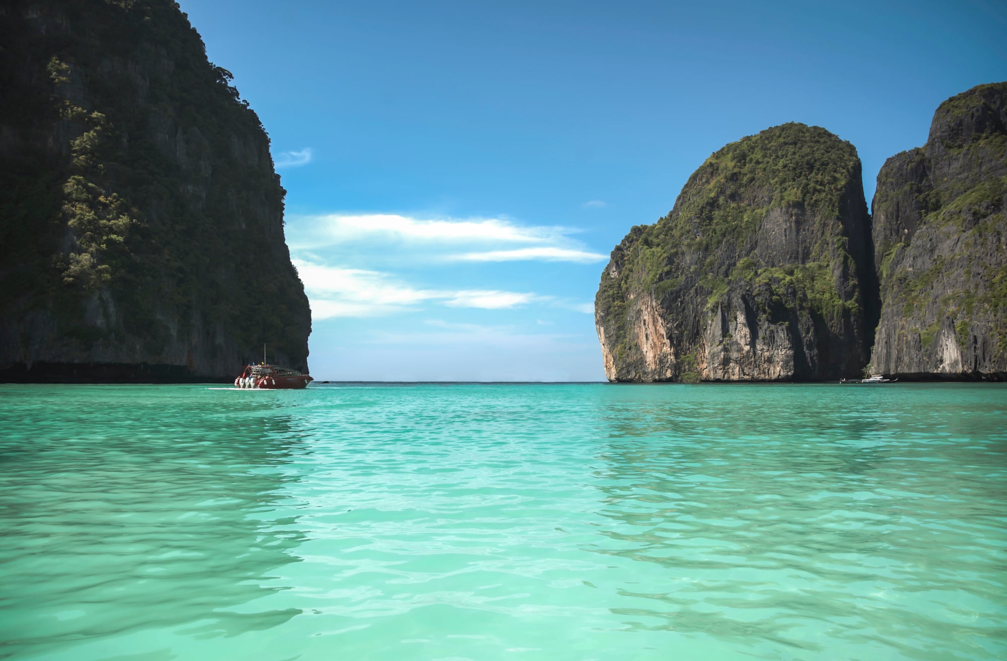 This Thai island showcases limestone karst at its most dramatic. Vertical cliffs rise directly from turquoise water, creating lagoons that feel more like outdoor cathedrals — the rock faces so sheer and tall that they frame the sky in narrow strips, and swimming in the protected waters below gives you the sensation of floating at the bottom of a geological well, though one filled with light rather than darkness.