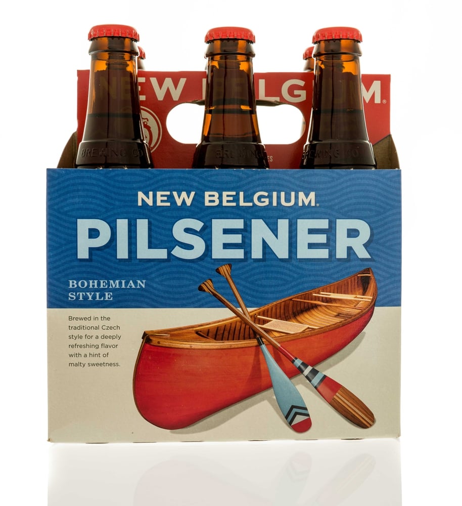 — Photo by homank76Winneconne, WI – 7 January 2017: Six pack of New Belgium pilsener beer on an isolated background.