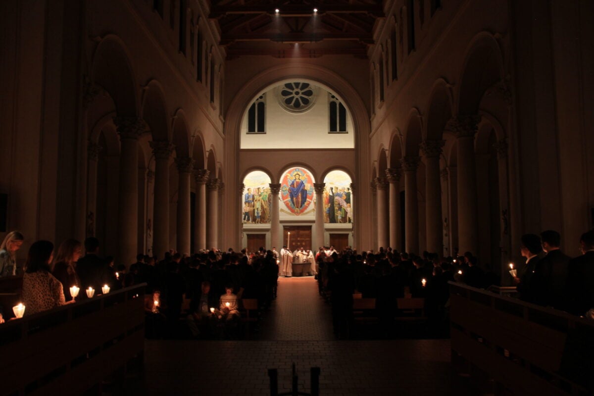 Churches light the Paschal candle first at the Easter Vigil service, then use it to light all other candles throughout the Easter season. The flame gets carefully maintained, and the candle burns at every baptism and funeral until the following year’s Easter.