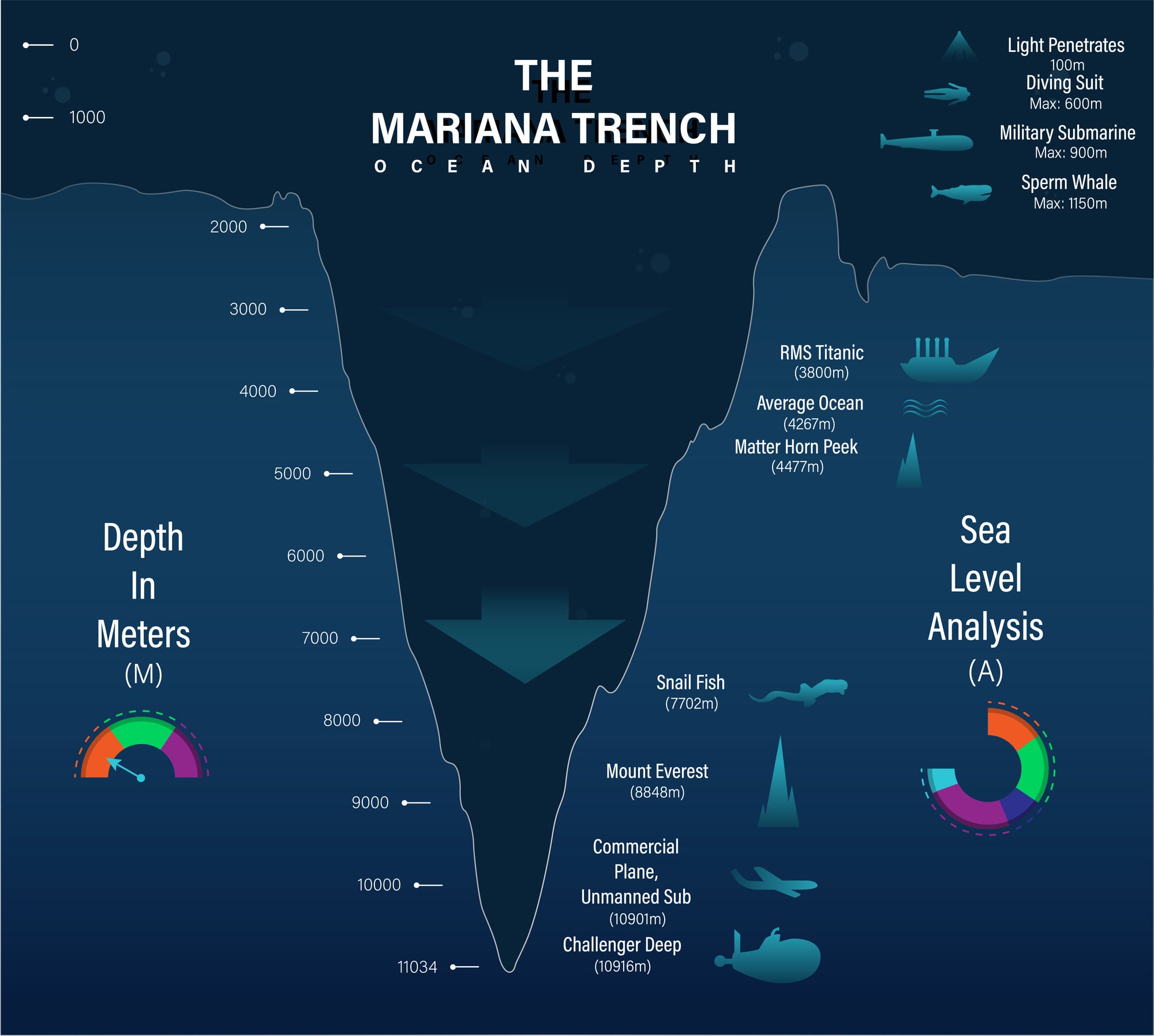 The deepest confirmed point in the Mariana Trench, Challenger Deep, measures approximately 36,070 feet (about 7 miles) below sea level. If Mount Everest were placed at the bottom of the trench, its peak would still be more than a mile underwater.