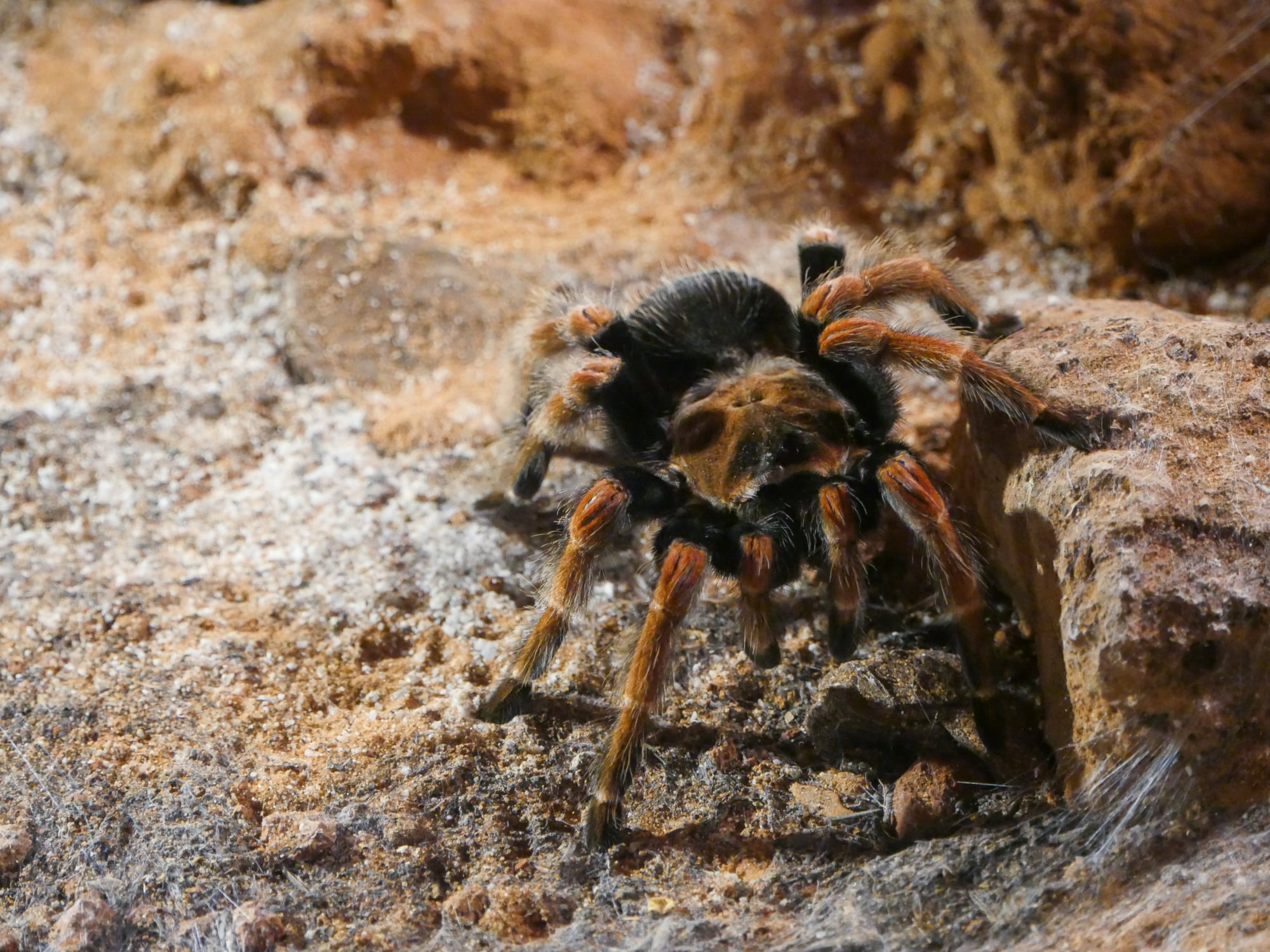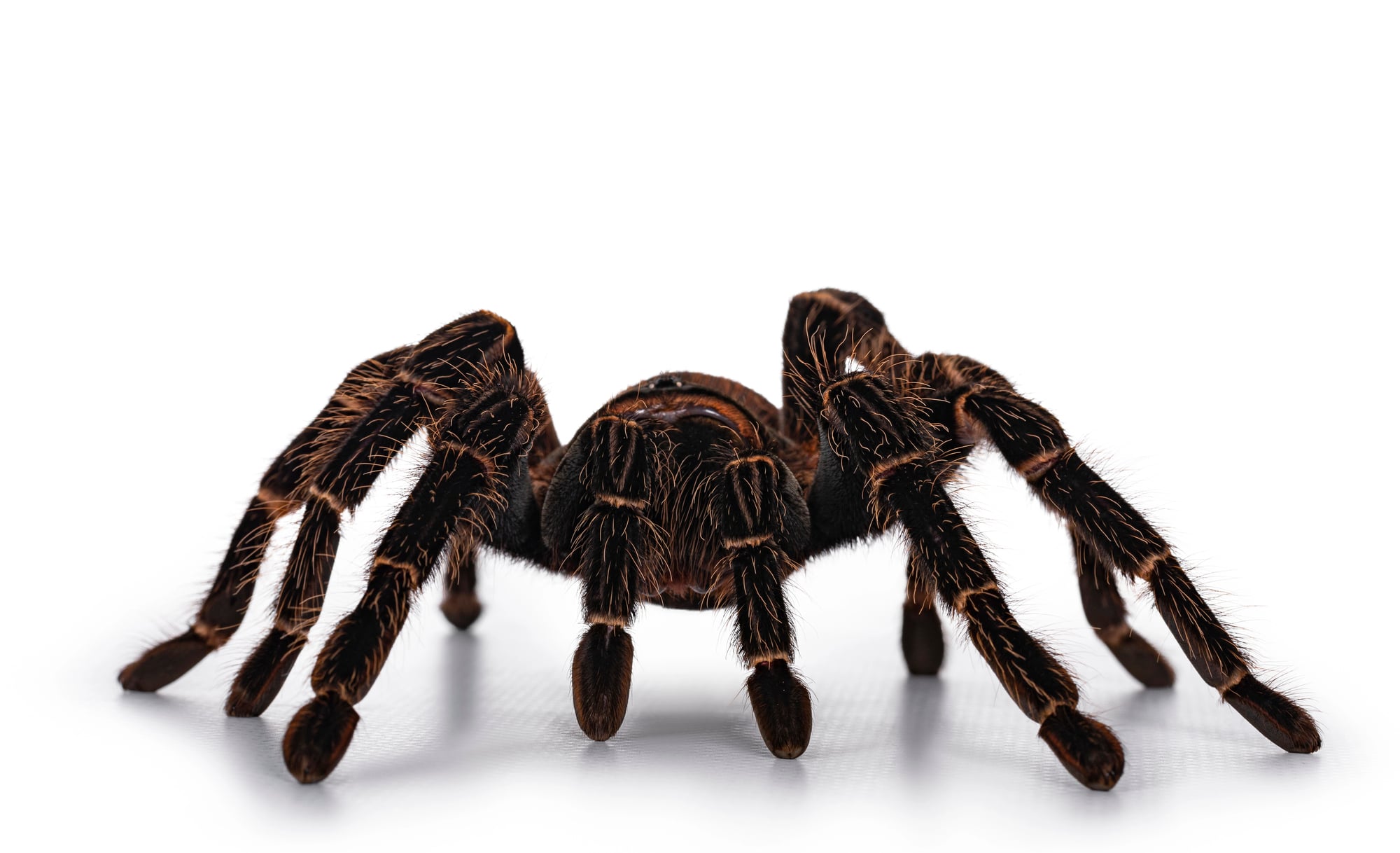 The Colombian Giant Redleg Tarantula (Megaphobema robustum) stands out thanks to its vivid leg coloring – black bodies with burnt-orange fuzz. It typically reaches about 7 inches in leg span and lives in the tropical forests of Colombia and Brazil.
