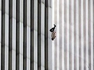 It shows a man falling from the North Tower of the World Trade Center, his body perfectly vertical, bisecting the iconic towers as he plummets toward earth.