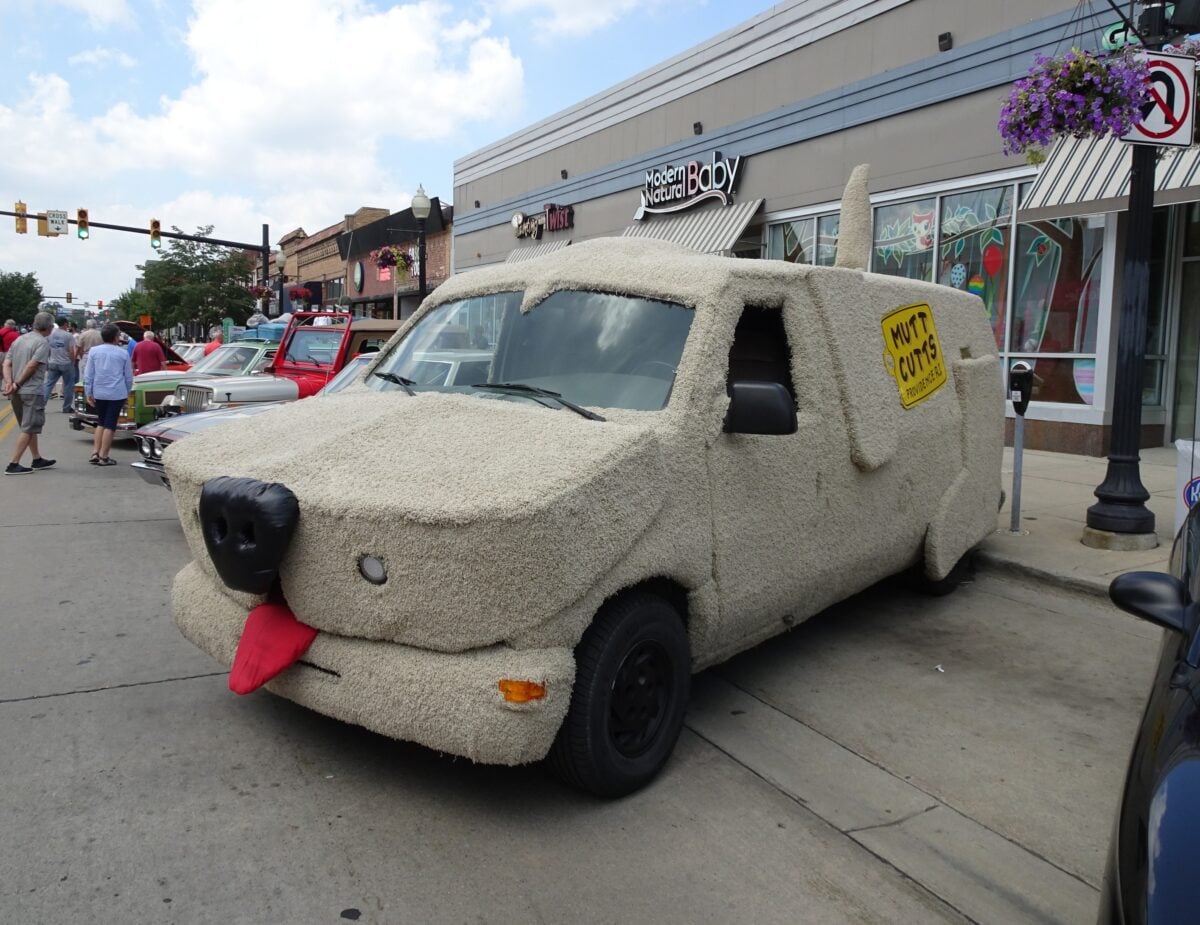The production went through several of these converted vans, but the one that burned was the hero car — the main vehicle used for close-ups and interior shots. So when you watch Jim Carrey’s face illuminate in the glow of those flames, you’re witnessing the destruction of automotive cinema history, even if that history involves a carpet-covered Econoline with a ridiculous dog head attached to it.