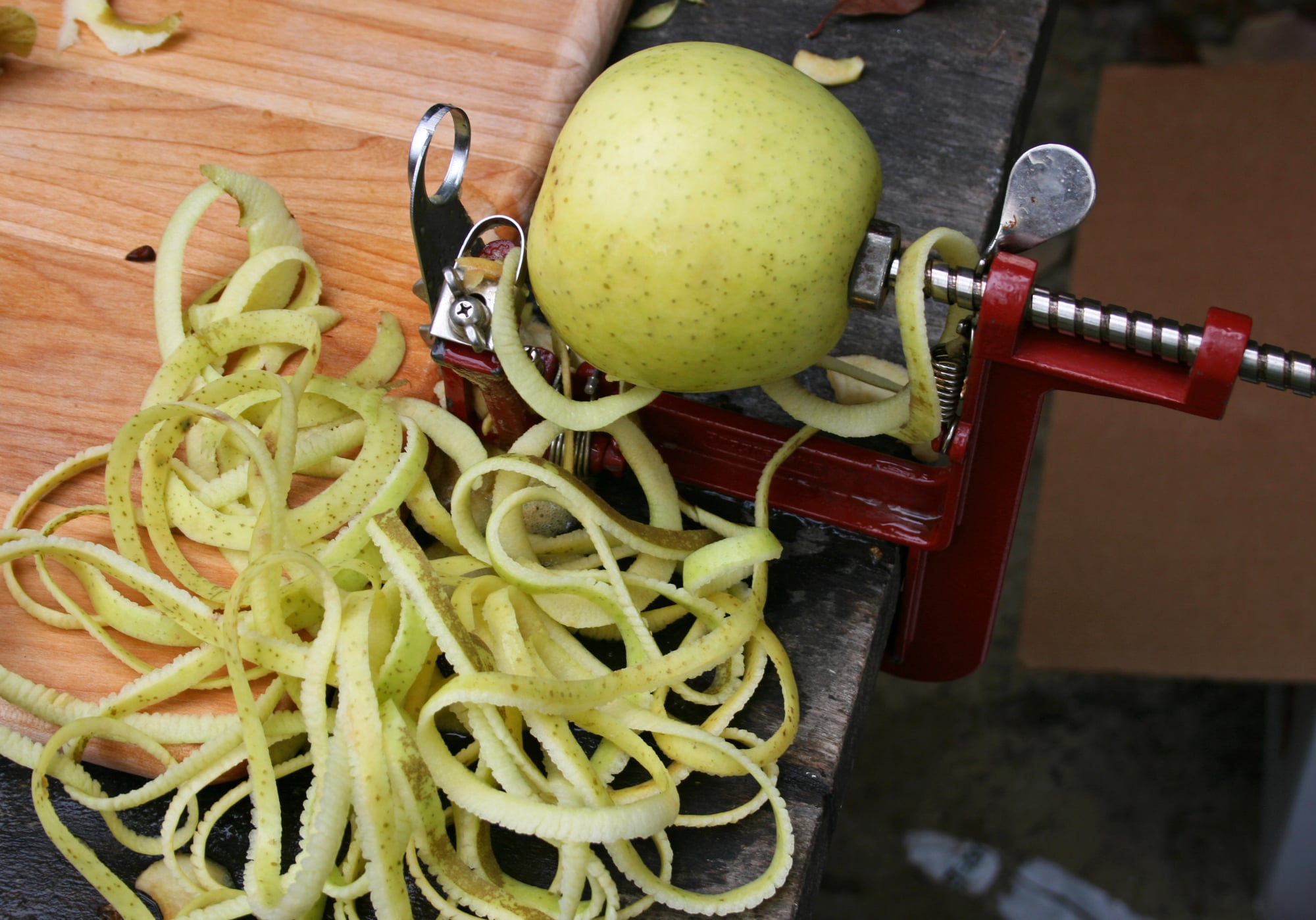When apple season arrived, out came the mechanical apple peeler to handle bushels of fruit. This contraption could peel, core, and slice an apple in one continuous spiral, leaving perfect rings ready for pies or drying.