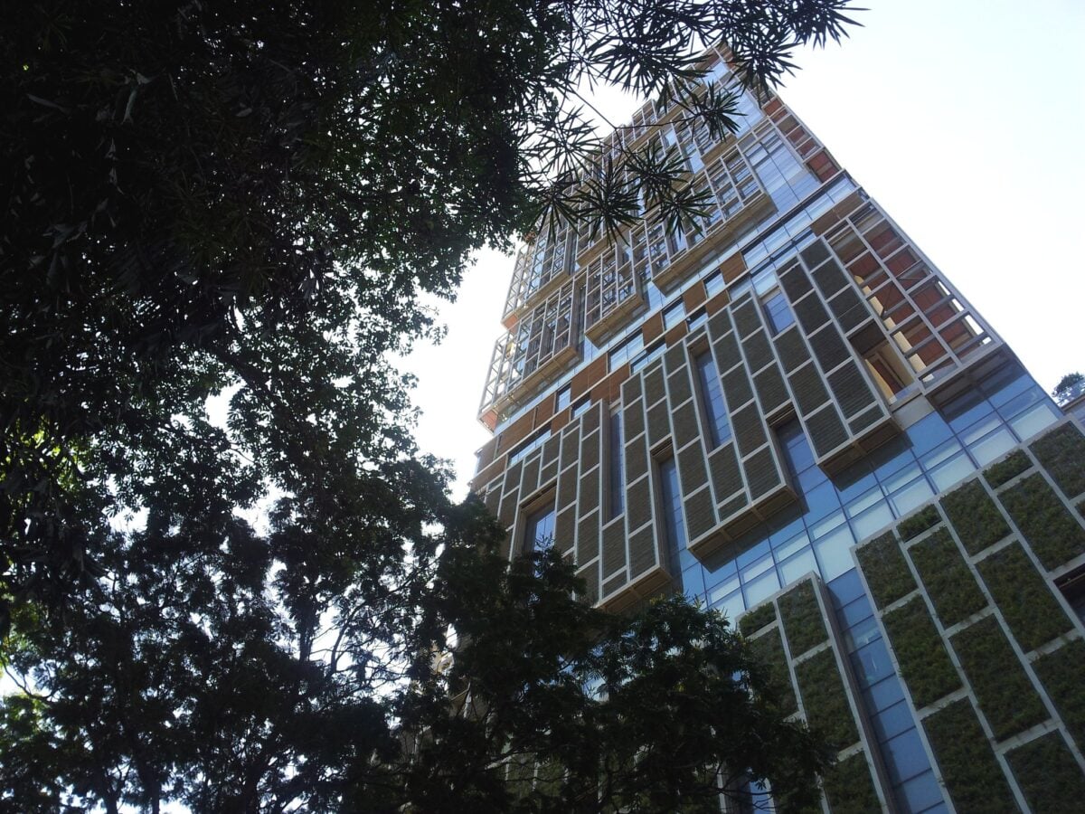 Its most distinctive feature is the ‘building within a building’ concept, with nine cylindrical buildings stacked inside a glass façade, creating nine sky gardens at different heights. The tower incorporates 43 sustainable technologies, including rainwater collection systems and wind turbines that power the building’s exterior lighting.