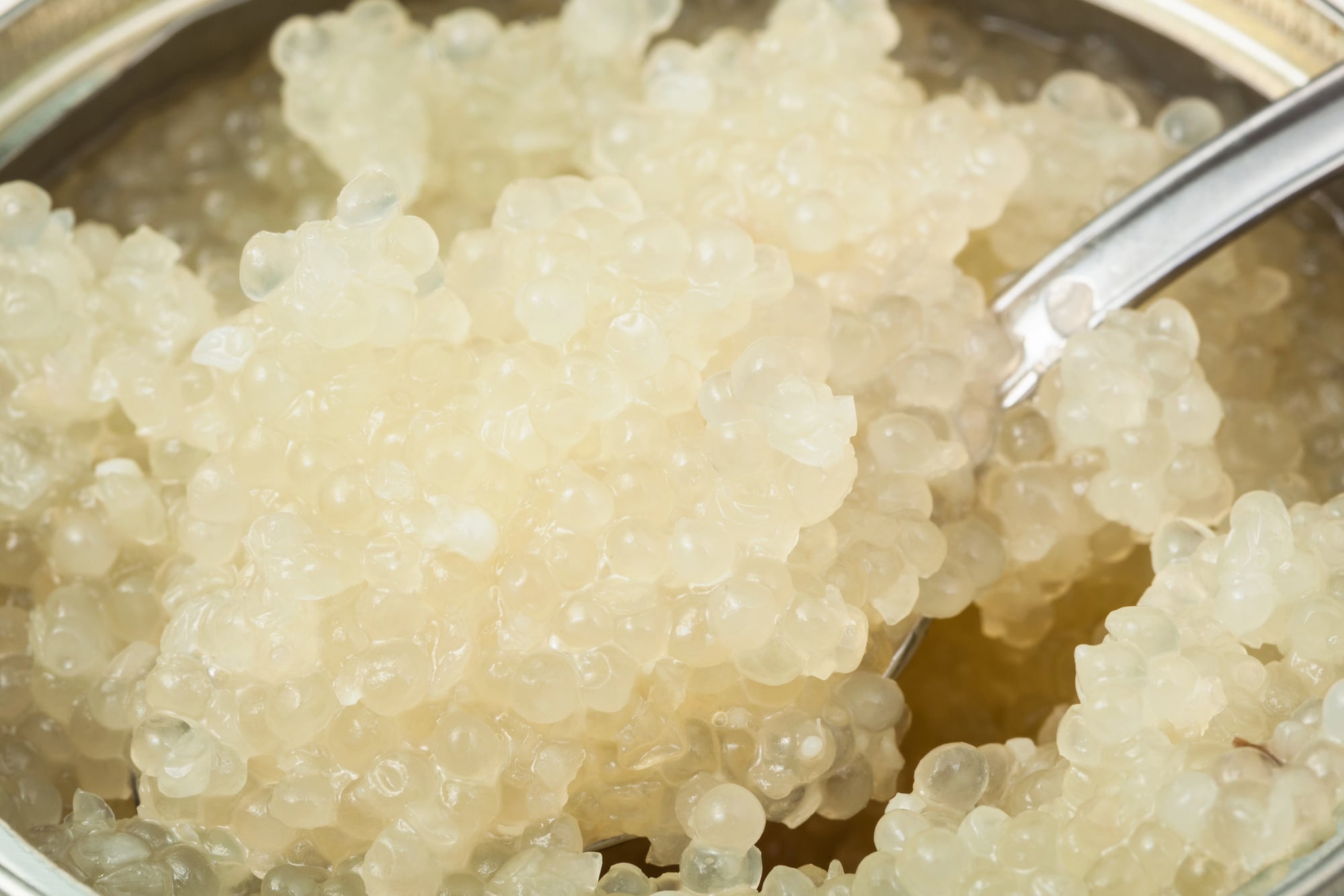 This comes from albino sturgeon that are rarer than the ones producing Almas caviar. The eggs are completely white, almost translucent, and the texture is delicate.