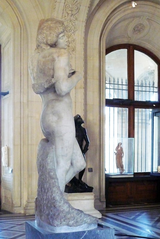 Originally sculpted to be part of Pope Julius II’s tomb, this unfinished marble sculpture dates from between 1513 and 1516. When the Pope’s ambitious tomb project was scaled back after years of delays and budget cuts, many of Michelangelo’s intended pieces were distributed to private collections. The sculpture’s unfinished state actually enhances its emotional impact, showing Michelangelo’s process while capturing the struggle between physical beauty and spiritual anguish that defined much of his work.