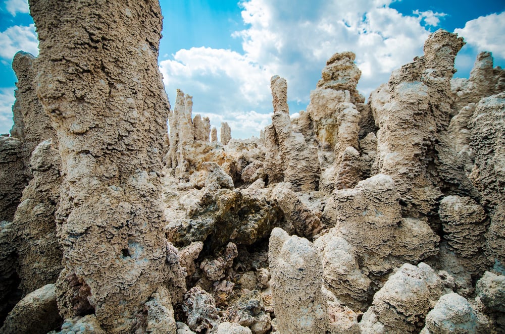 California’s Mono Lake tufa towers formed as underwater springs deposited calcium carbonate in the lake’s alkaline waters. When Los Angeles began diverting water from the lake’s tributary streams, the dropping water level exposed these limestone sculptures to create an alien-like landscape.