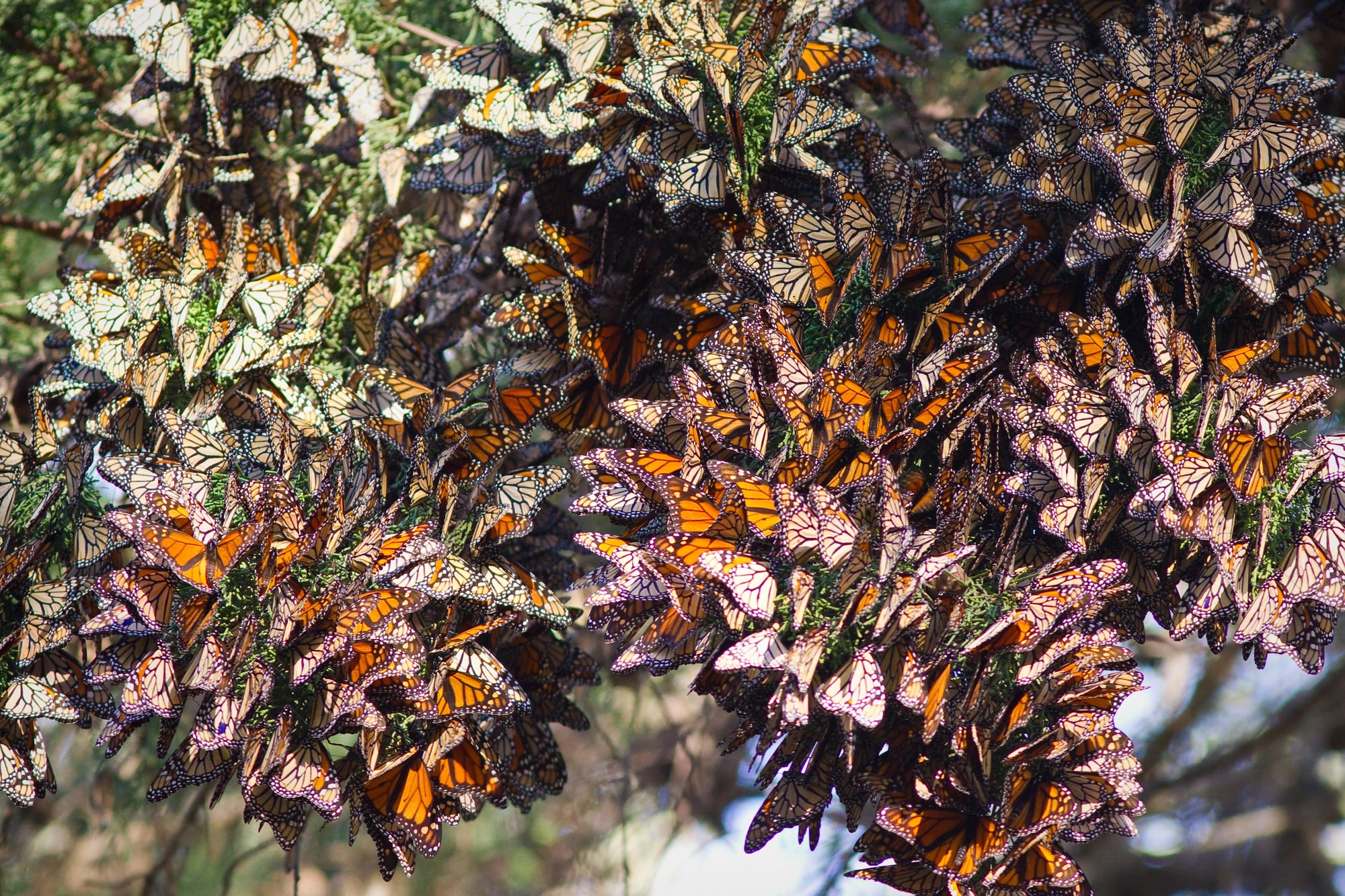 Millions of monarch butterflies travel up to from Canada and the US to Mexico’s oyamel fir forests every autumn. Their dense clusters on tree branches transform entire forest sections into vibrant orange blankets that seem to breathe with collective movement.