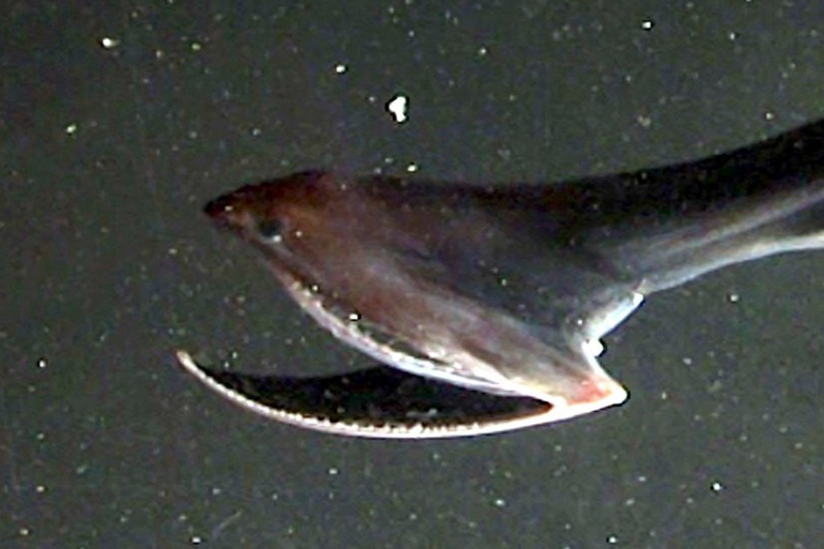 These small fish might not seem threatening at first glance, but their alien-like appearance and glowing photophores create an eerie light show in the darkness. Their thin, blade-like bodies and upward-pointing eyes give them a haunting profile that looks more like a ghostly apparition than a living creature.