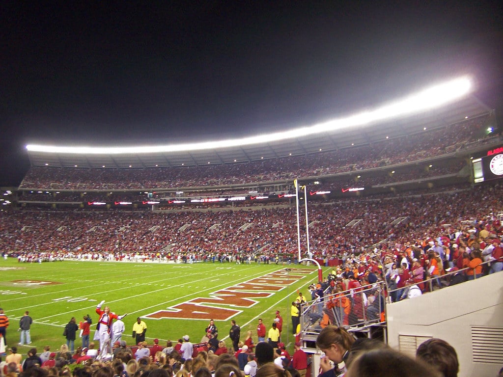 Bryant-Denny holds over 100,000 fans and the crimson in the stands is dense and unbroken. The stadium is named for two coaches — Paul “Bear” Bryant and Dr. George Denny — which tells you something about how seriously Alabama takes its football history.