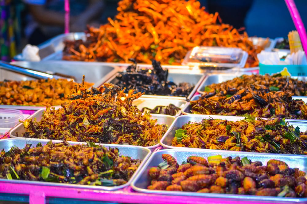 Grasshoppers, crickets and mealworms are rich in protein and contain significantly higher sources of minerals such as iron, zinc, copper, and magnesium than beef. In Thailand, traditional markets often have stalls selling deep-fried grasshoppers and crickets. They’re typically seasoned with salt, pepper, or chili and have a nutty, crunchy texture that many compare to roasted nuts or popcorn.