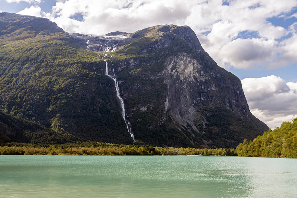 The falls are accessible via hiking trails from the nearby village of Luster, where visitors can experience both the waterfall and the broader glacial landscape.
