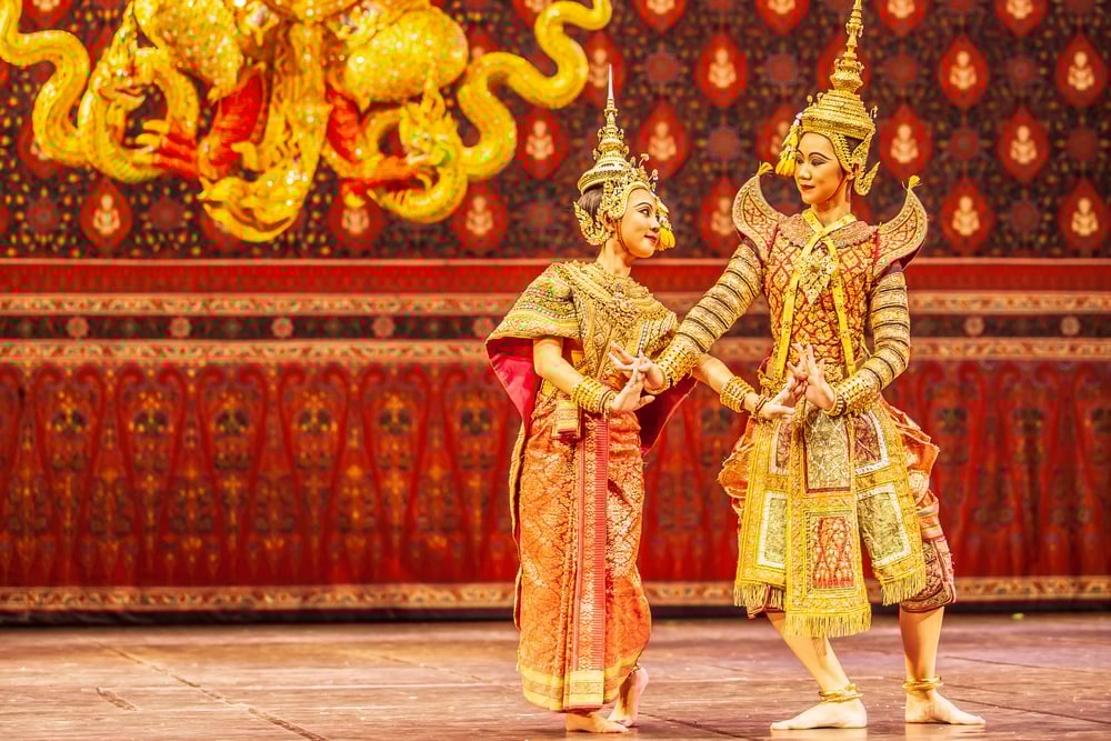 Thailand’s classical dancers favor gold pigments layered across eyes and cheeks, accented by brows sculpted into precision. Scarlet lips seal the look.