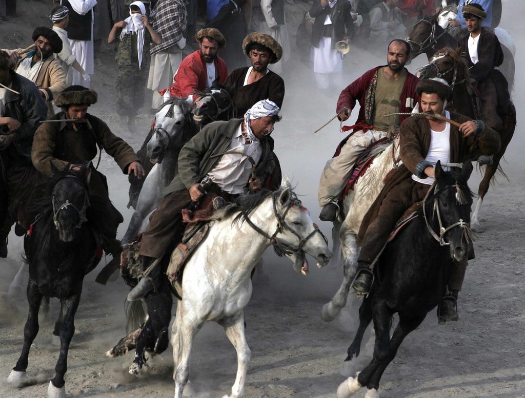 Central Asian horsemen grab a headless goat carcass and attempt to carry it to a scoring circle while dozens of other mounted riders try to wrestle it away. Buzkashi makes modern polo look like a gentle afternoon ride.