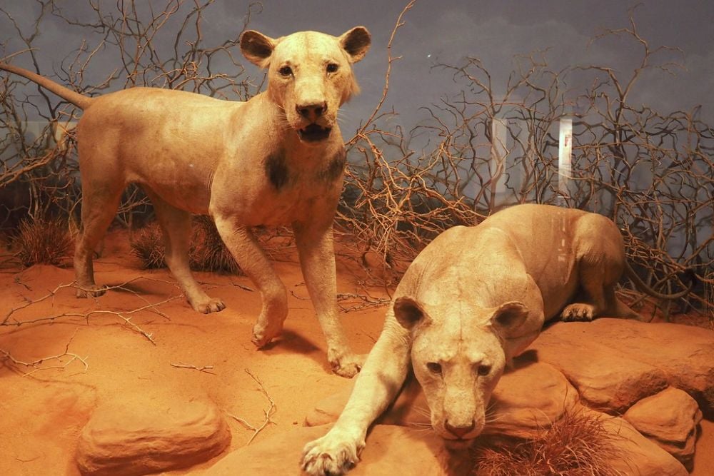In 1898, two lions repeatedly attacked workers constructing a railway bridge in Kenya. Dozens of men were dragged from tents at night, creating widespread panic among the laborers.