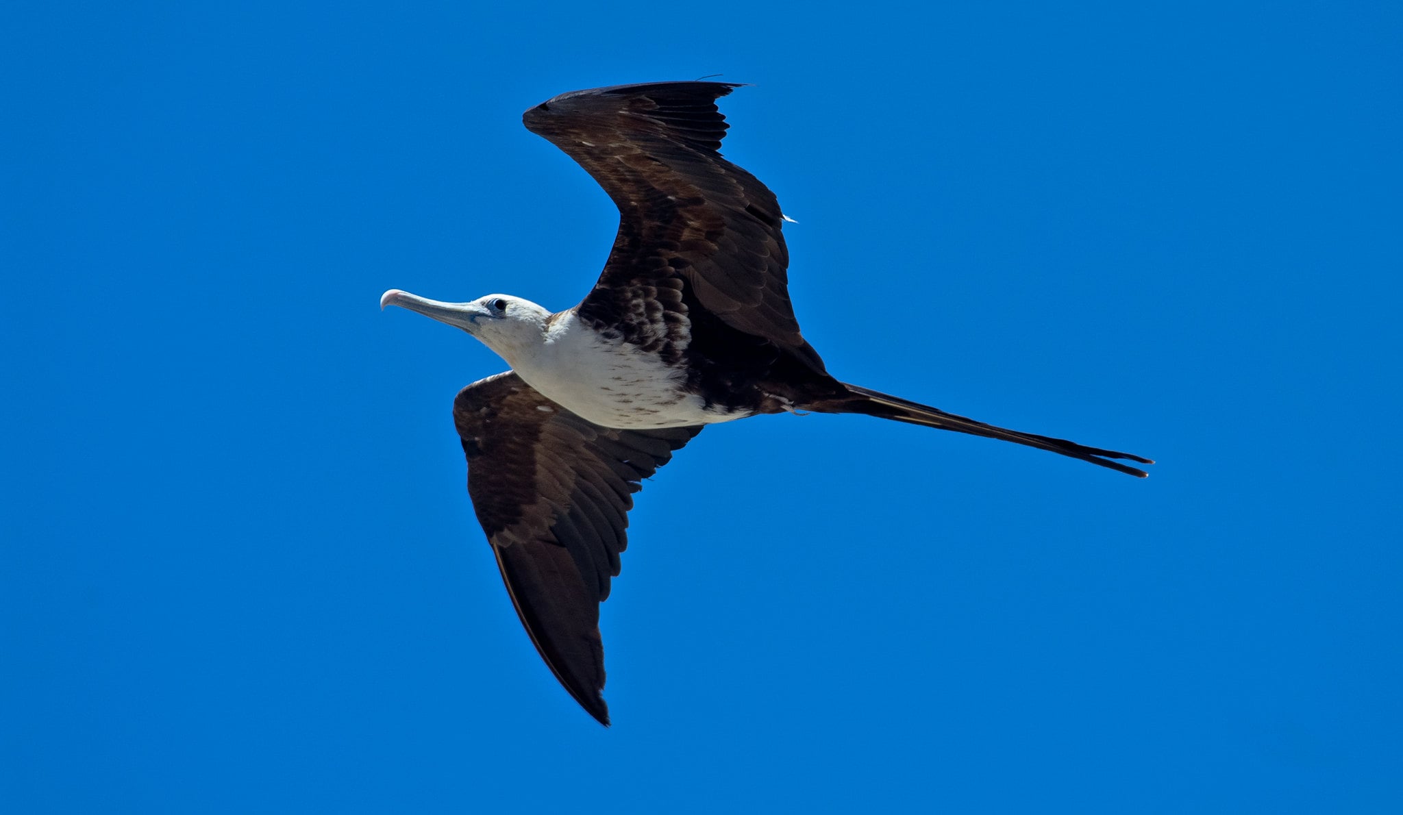 With their impressive seven-foot wingspan and lightweight bones, Great Frigatebirds are built for marathon flights. They can soar for weeks without landing — using thermal currents to stay aloft while scanning the ocean for food.