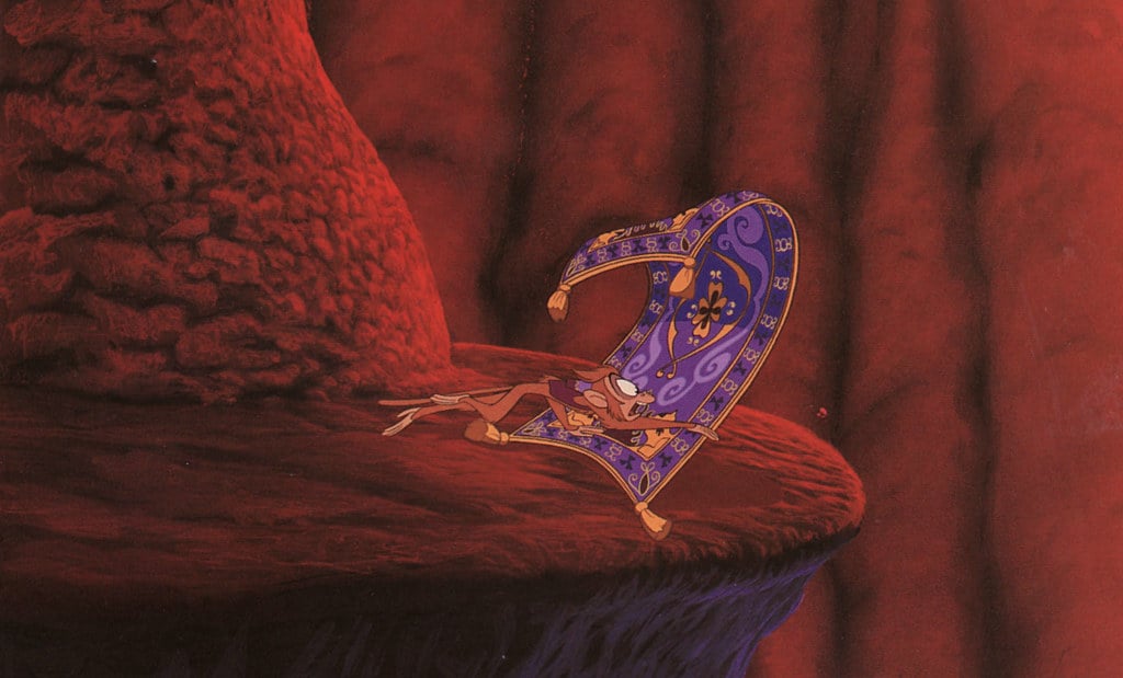 Aladdin’s magic carpet makes appearances outside its own movie. It hangs in the background during Beauty and the Beast and shows up folded in Lilo & Stitch.