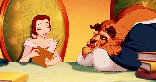 Beauty and the Beast’s library contains books that reference other Disney stories. The spines show titles that correspond to Sleeping Beauty, Cinderella, and other fairy tales Disney has adapted.