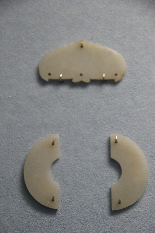Plaques and dress ornaments were carved from thin slabs of jade, including small figurines, masks, and birds and animals carved in the round. These decorative elements adorned court robes and palace interiors, creating an atmosphere of refined luxury. Many of these small jades were gifts between friends or good luck tokens, sometimes featuring puns like deer (lu) meaning prosperity (lu).