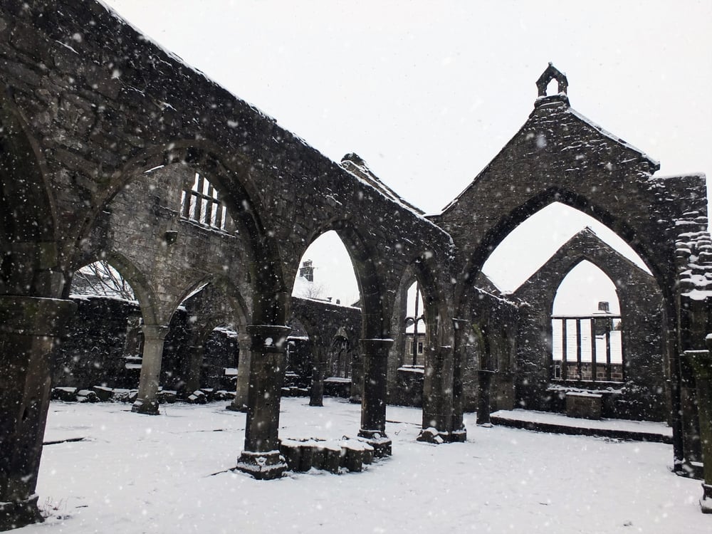 The abbey’s ancient past and weather-beaten presence add a layer of historic gloom that perfectly matches the novel’s dark themes.