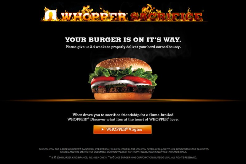 In 2009, Burger King launched a Facebook app that offered a free Whopper to anyone who would delete ten friends from their account. The app would notify those friends they’d been dumped for a burger with the message: ‘Your friendship is worth less than a Whopper.’
