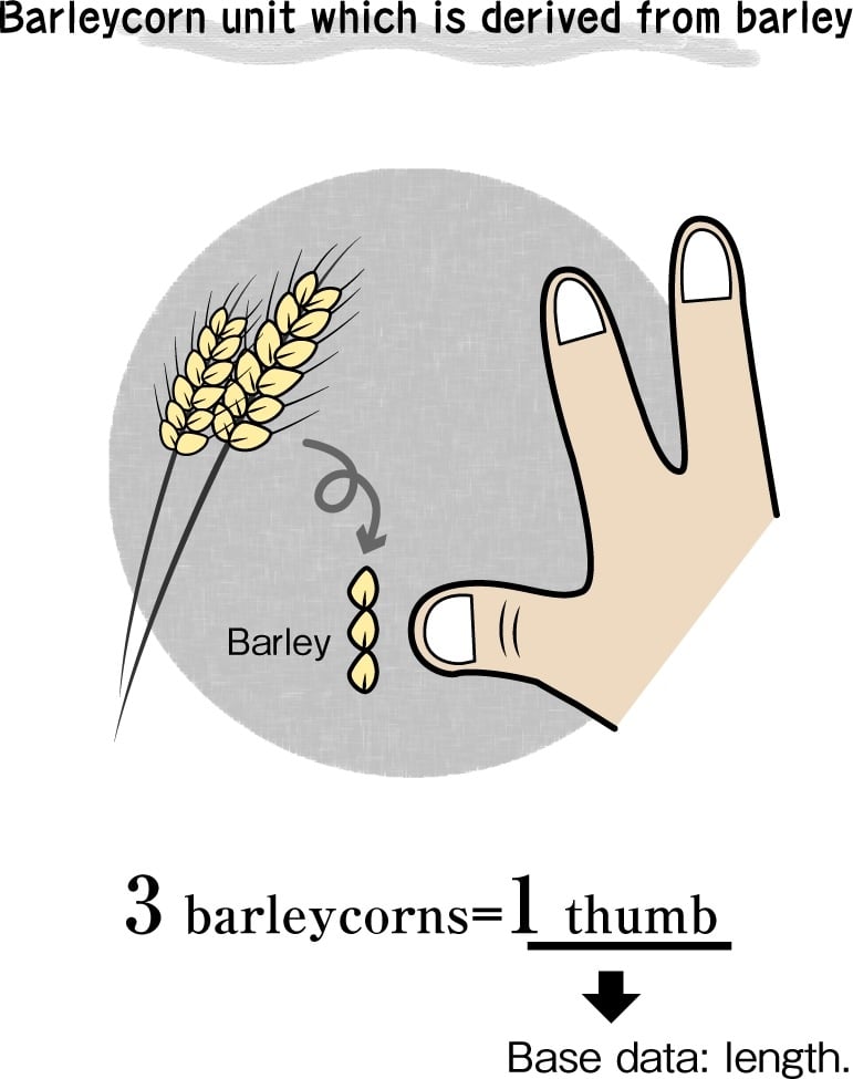 While not directly a body part, the barleycorn related to body measurements as it originally measured the length of a grain of barley, which approximated the width of a thumb. At one-third of an inch, three barleycorns equaled one inch in the English system.