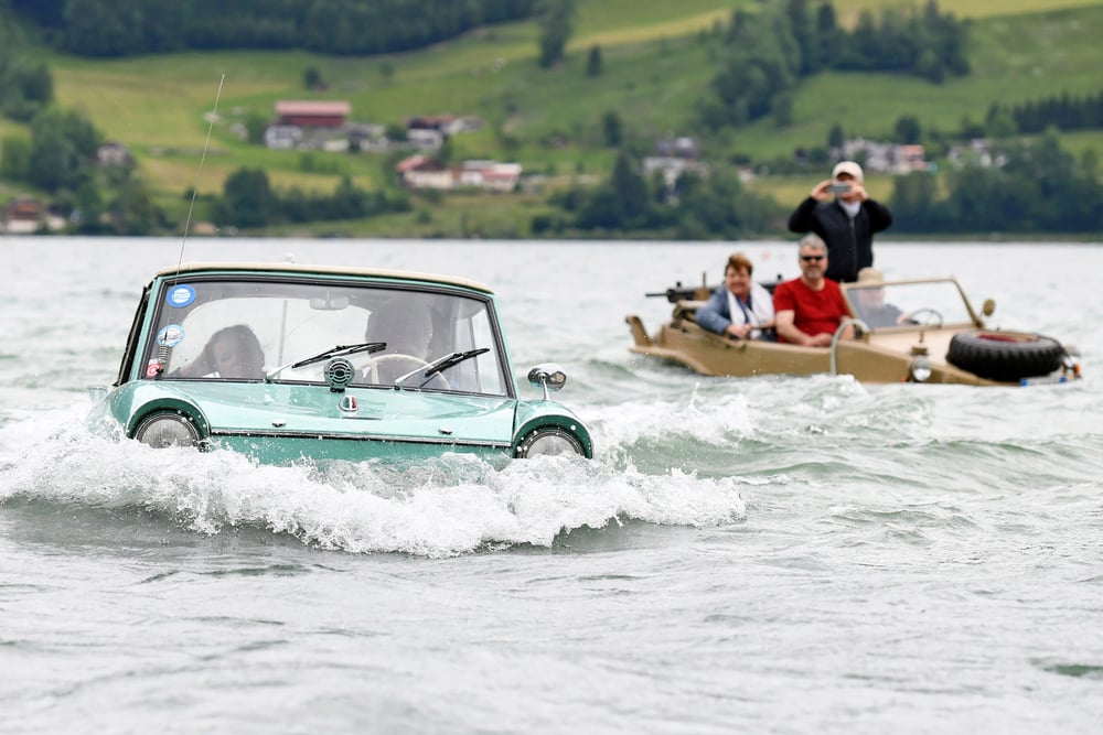 Ocean crossings have been accomplished by vehicles that can function both on land and in the water. ‘Half-Safe,’ a modified Ford GPA amphibious jeep, drove Ben Carlin across the world in 1998, traversing both the Atlantic and Pacific oceans.