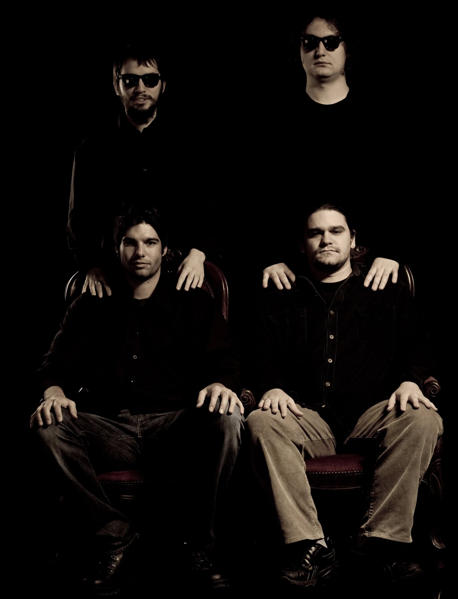 The black backdrop isolates the figures, emphasizing their connection while highlighting the space between them.