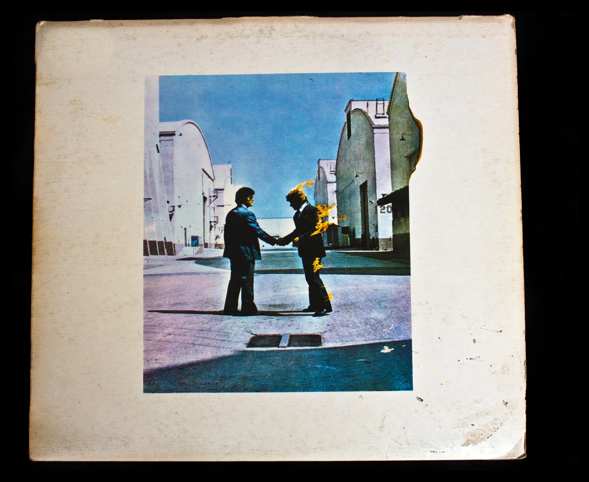 The image of two businessmen shaking hands while one bursts into flames created an unsettling commentary on music industry relationships. The surreal quality perfectly complemented the album’s themes of absence and loss while establishing a visual language for corporate critique.