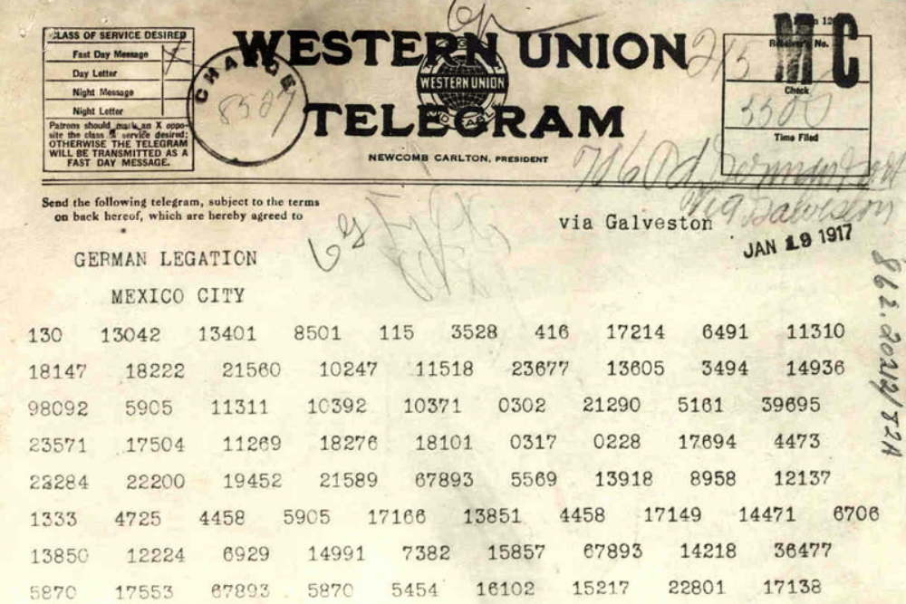British intelligence intercepted and decoded a secret German diplomatic cable in 1917 that proposed a military alliance between Germany and Mexico against the United States. The telegram promised Mexico the return of Texas, Arizona, and New Mexico if they joined Germany in case America entered World War I.