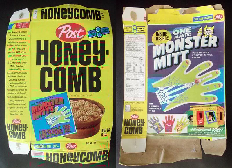 Monster Mitts were found in Honey-Comb cereal in 1974 and were cheap plastic gloves with ghoulish designs. One looked like skin was unzipping to expose bones, another had blue veins and an eyeball, another was scaly like a sea monster, and the fourth had red veins with a spider crawling up them. The marketing encouraged kids to ‘trade with friends and collect all four Monster Mitts’. These gloves turned ordinary hands into creepy claws, perfect for Halloween or just general mischief.