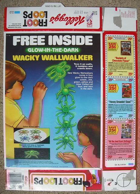 These glow-in-the-dark, rubbery octopus-shaped creatures could be tossed at walls and would slowly ‘crawl’ down to the ground as they stuck and unstuck themselves. They became one of the biggest fads of the 1980s, appearing in various Kellogg’s cereals including Froot Loops and Corn Pops. Though some kids reported disappointment when theirs didn’t work properly, successful WallWalkers provided endless entertainment. The sticky, translucent toys left marks on bedroom walls that probably still exist in houses today.