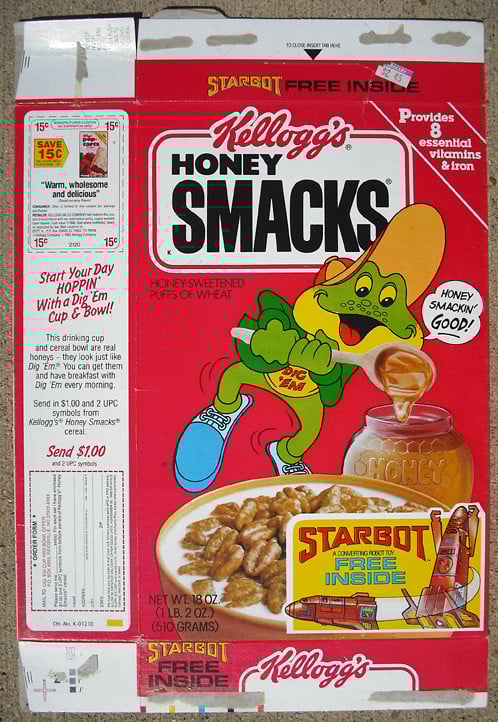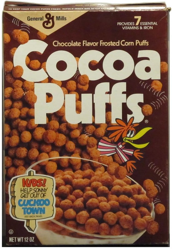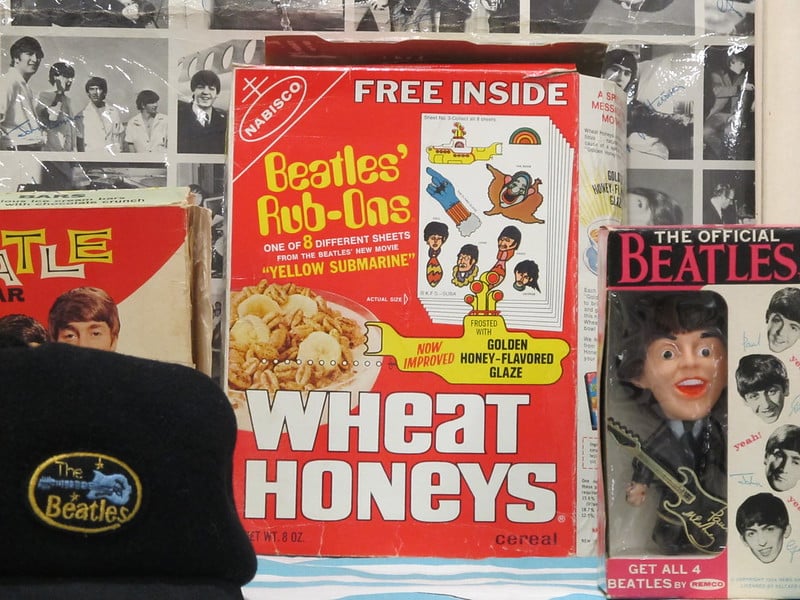 In 1968, coinciding with the release of ‘Yellow Submarine,’ boxes of Rice Honeys and Wheat Honeys featured Beatles-themed packaging and Beatles Rub-Ons as prizes. These featured eight different rub-on sheets with fantastic characters from the movie that kids could apply to books, bowls, and basically everywhere. The timing was perfect during Beatlemania, and these prizes let kids carry a piece of rock history with them. Today, these Beatles cereal boxes are among the most prized and valuable boxes among collectors, garnering around $1,000 in online auctions.