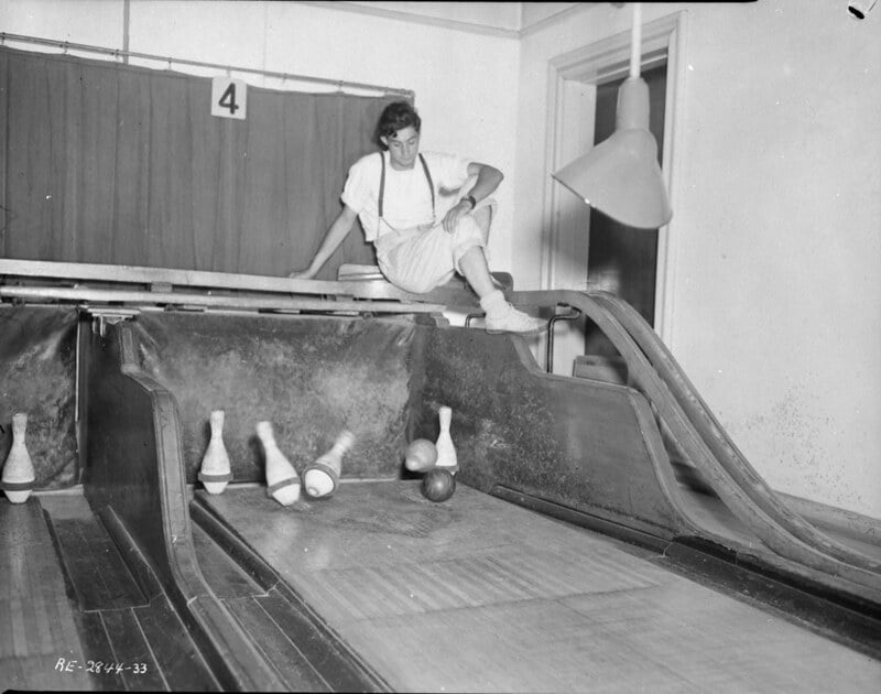 Before automatic pin-setting machines became standard, young workers called pin boys manually reset bowling pins after each frame. They crouched behind the pins, quickly clearing fallen ones and arranging them for the next roll.