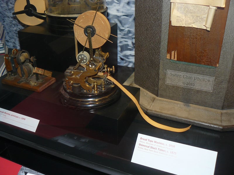 Financial markets relied on ticker tape machines that printed stock prices on long strips of paper. Operators maintained these machines, changed the paper, and ensured the continuous flow of market information.