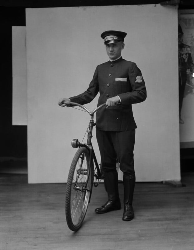 Western Union and other telegraph companies employed messengers who delivered telegrams door-to-door, often riding bicycles or motorcycles. They carried pouches full of messages and were trained to handle both routine business communications and urgent personal news.