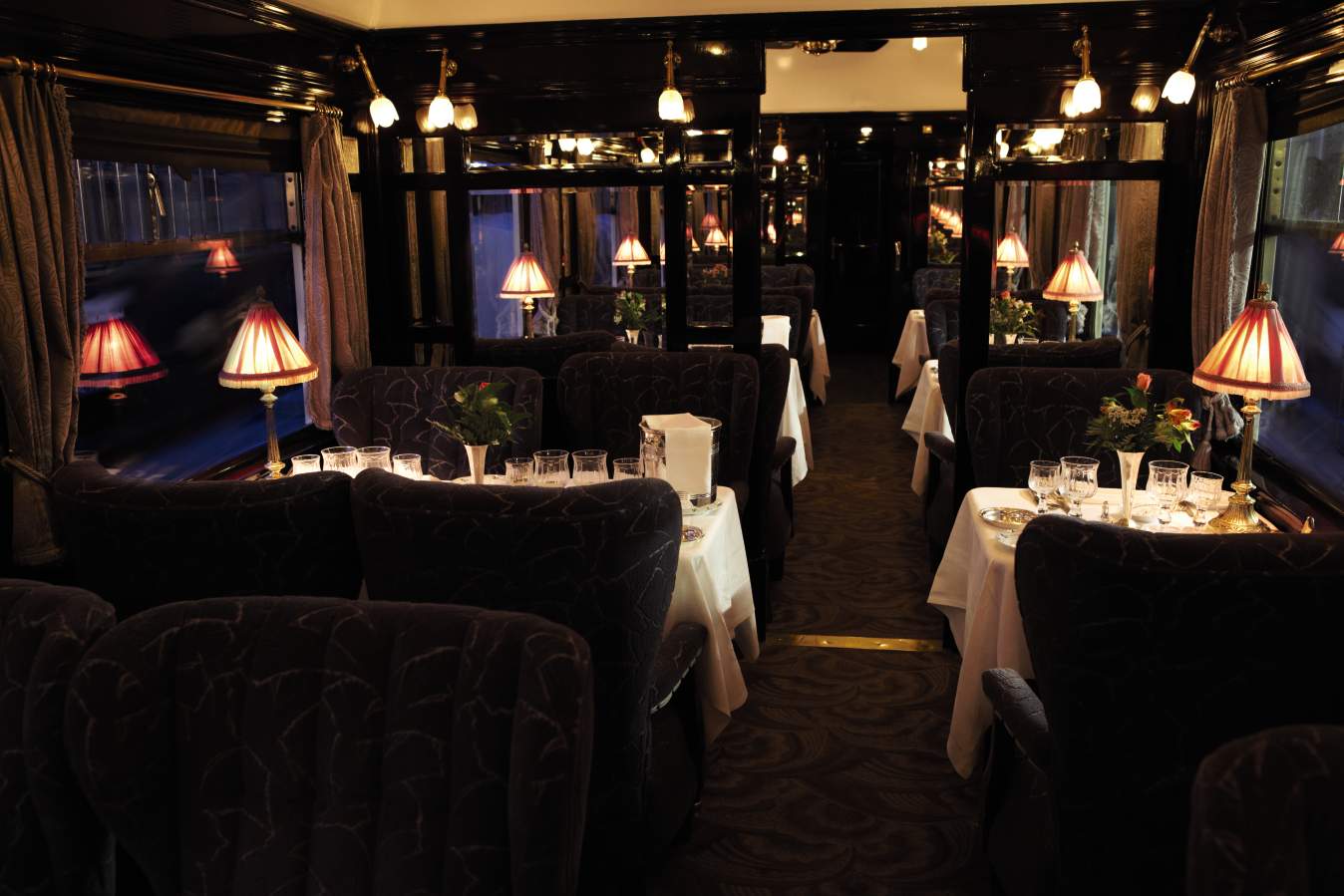 The British Pullman’s parlour cars are known for their art deco design and restored interiors. Polished wood, brass details, and carefully chosen fabrics create a refined setting.