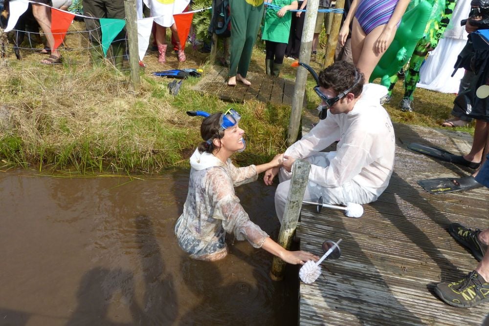 Wales hosts world championships where people swim through muddy water trenches wearing flippers and snorkels. You can’t see anything in the murky bog water – swimmers just feel their way along the bottom.
