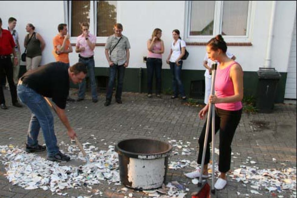 Once the dish breaking is done the bride and groom then work together to clean it up as preparation for the future.