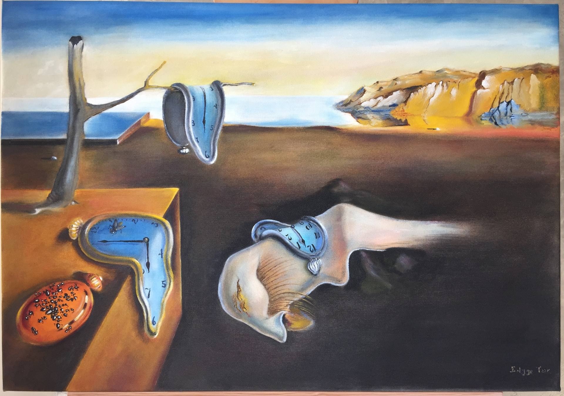 The landscape in the background depicts the cliffs near Dalí’s home in Catalonia, grounding the fantastical elements in a real place.