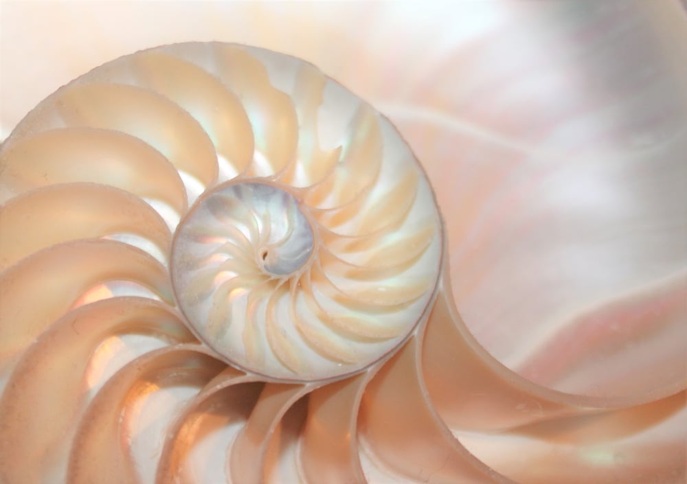 Nautilus shells grow in a logarithmic spiral that maintains the same proportional shape as the shell gets larger. Each new chamber is exactly the same shape as the previous one, just scaled up by a constant factor.